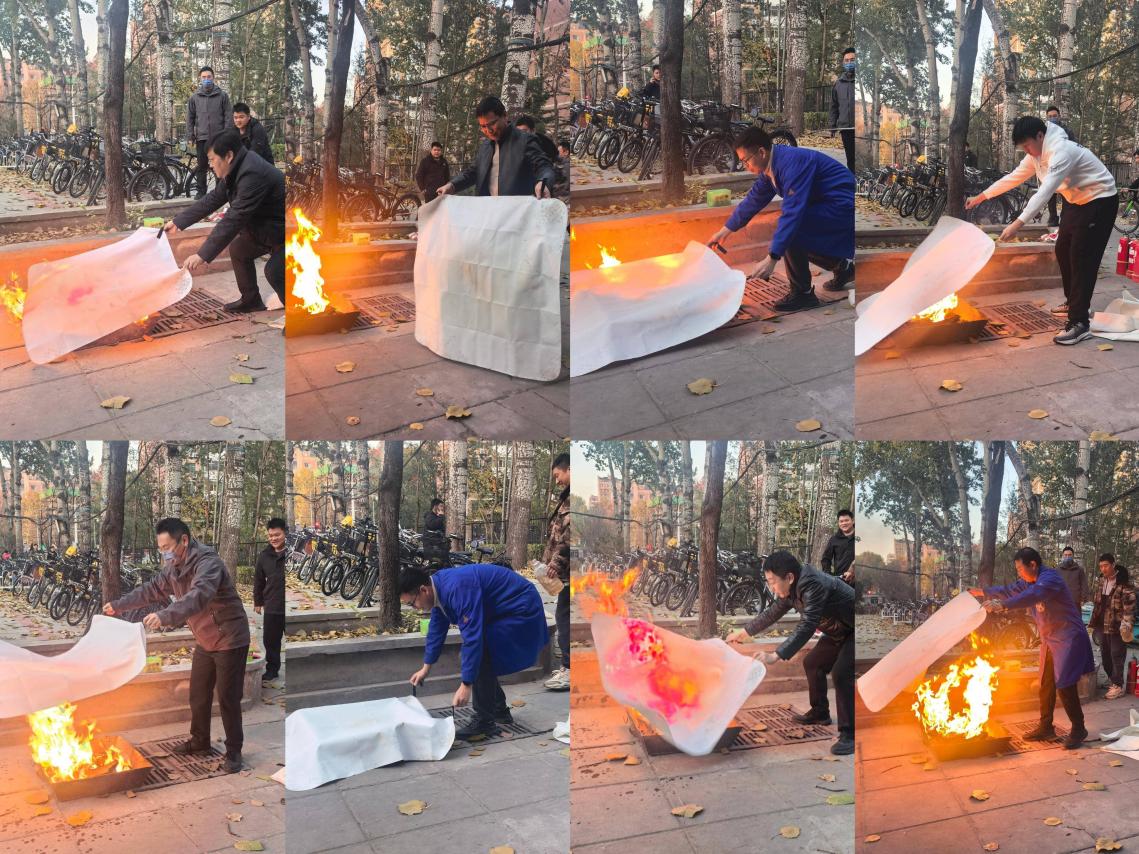 在模拟火盆实操区,教职工们轮流上阵,亲身实践灭火毯与消防面具的使用方法。大家严格按照指导人员的要求,实际操作灭火毯,成功扑灭火源。